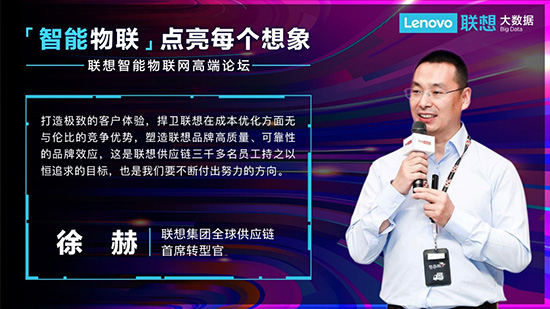 论坛上,联想集团全球供应链首席转型官徐赫与大家分享了智能物联网与供应链优化的内容。在供应链方面,联想将重点在两个领域推动智能物联网战略的落地实践。在消费物联网领域,联想将持续发挥供应链在采购、制造等方面的优势以及公众化能力,协同自有及外包合作伙伴,提供对于所有智能化设备的生产工程以及质量管理的需求,让客户不仅能够“买得到”联想产品,更能够“用得好”。在商用物联网领域,联想则更多发挥供应链在全球的品牌作用,充分运用生态体系的影响力,结合联想对于质量、运营以及数字化转型的经验和心得,形成解决方案,最终促进智能化商业物联网应用案例的落地。