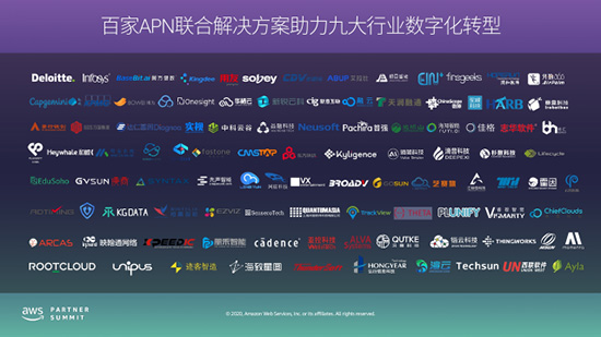 在2020年9月9日举办的AWS合作伙伴峰会2020上,亚马逊云服务(AWS)宣布将携手APN合作伙伴进一步拓展中国合作伙伴生态,以更好地服务客户的数字化转型和数字创新需求。AWS宣布与毕马威、神州数码分别达成战略合作关系,结合AWS全球领先的云技术和服务,以及合作伙伴的技术解决方案,推动企业上云和拥抱数字化。此外,AWS还宣布联合百家APN合作伙伴打造行业解决方案,重点覆盖金融、制造、汽车、零售与电商、医疗与生命科学、媒体、教育、游戏、能源与电力九大行业。