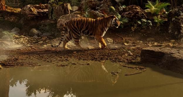 老虎本身既被阳光照耀,又被树木遮挡。当它穿过树林时,其倒影在下面的池塘中清晰可见。为了实现这种具有直接和间接反射的丰富视觉效果照明,需要为场景中的每个像素计算数千条路径。