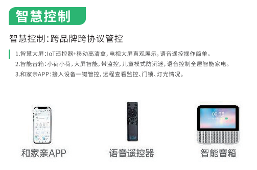 在利用千兆网络连接多种智能终端的前提下,对于控制智能家电,你可以直接对着和目智能音箱说一声:”小荷小荷,打开电视”、”小荷小荷,把灯调亮点”,空调就会打开,台灯就会变亮,你可以使用和目智能音箱控制家里的一切智能联网设备。智能音箱成功地取代了各种遥控器,真正成为了一个家庭的智能控制中心,再也不怕你需要这些遥控器时他们玩消失了。