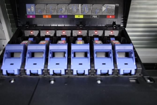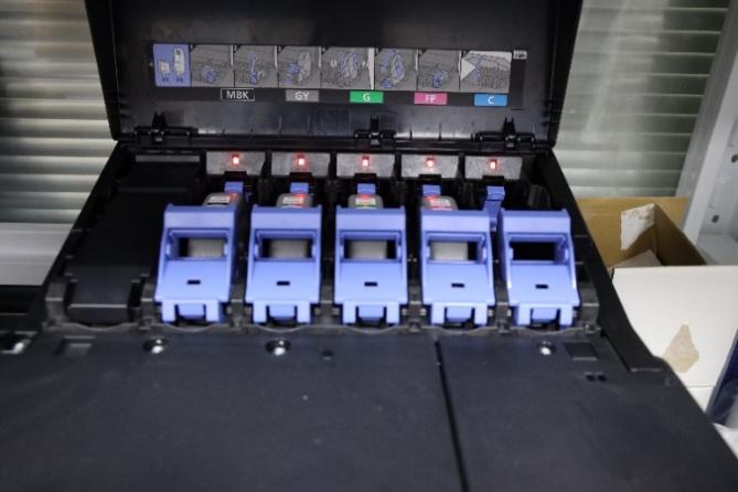佳能GP-520产品共有11种颜色的墨水,其不仅搭载了黑(BK)、粗面黑色(MBK)、青(C)、品红(M)、黄(Y)五个基础色,改善颗粒感和灰阶跳跃的灰色(GY),还有增加色彩饱和度的红(R)、橙(O)、绿(G)、紫色(V)四个特殊色,更有水性颜料荧光粉墨水(FP)。GP-520通过“灵动亮彩”数据处理技术对新开发的荧光粉色墨水与其他颜色墨水在纸面上的叠加方式进行优化,可以使输出作品的特定区域脱颖而出,实现明亮柔和且层次丰富的色彩再现,同时还可以在图像的指定区域内输出荧光专色的效果,令图像表达更具冲击力。