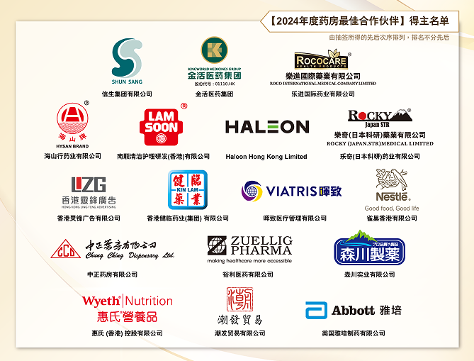 香港药房行业的繁荣与进步,离不开众多优秀合作伙伴的鼎力支持。多年来,港九药房总商会与业界各相关企业保持着紧密的合作关系,共同致力于为市民提供安全、有效、便捷的健康产品和服务。本届《药房最佳合作伙伴》奖项的设立,旨在表彰那些在过去一年中与港九药房总商会携手并进,为市民健康保驾护航的杰出企业。这些企业在产品质量、服务创新、社会责任等方面表现卓越!
