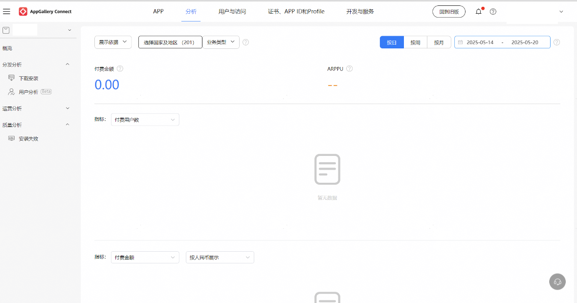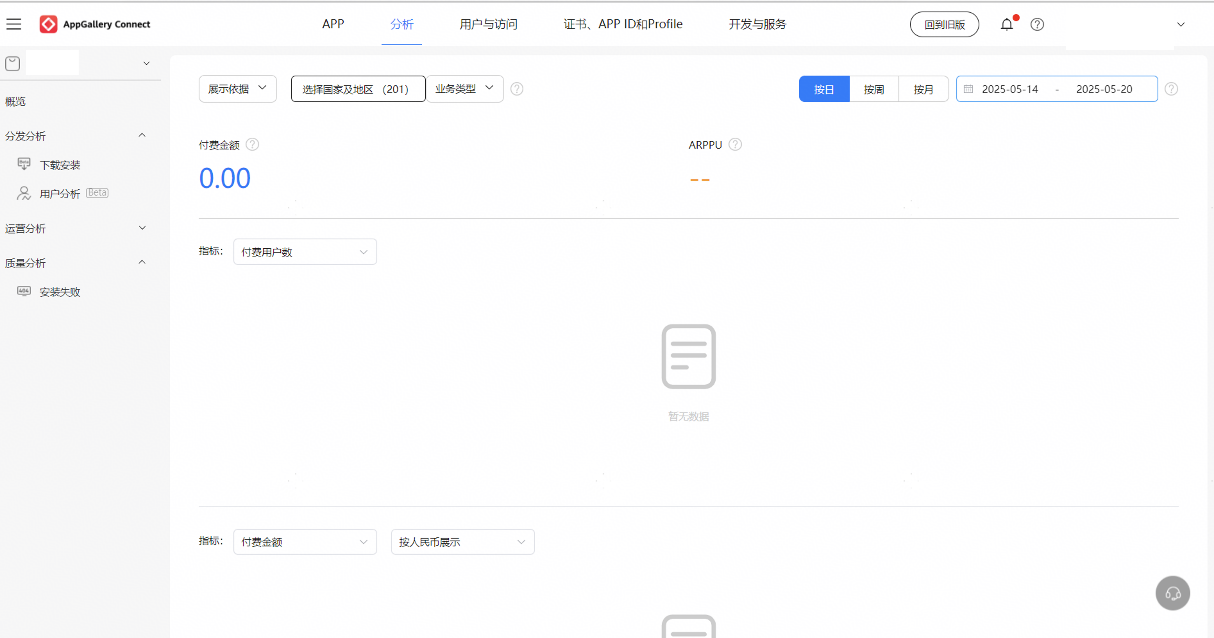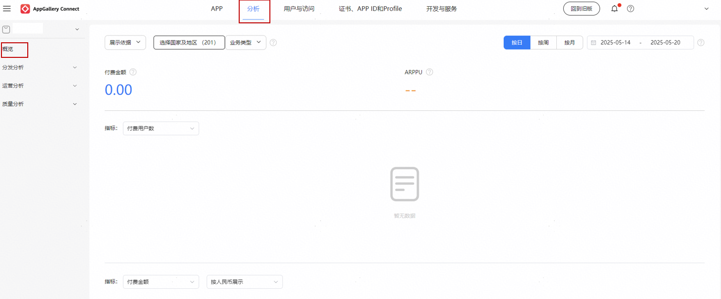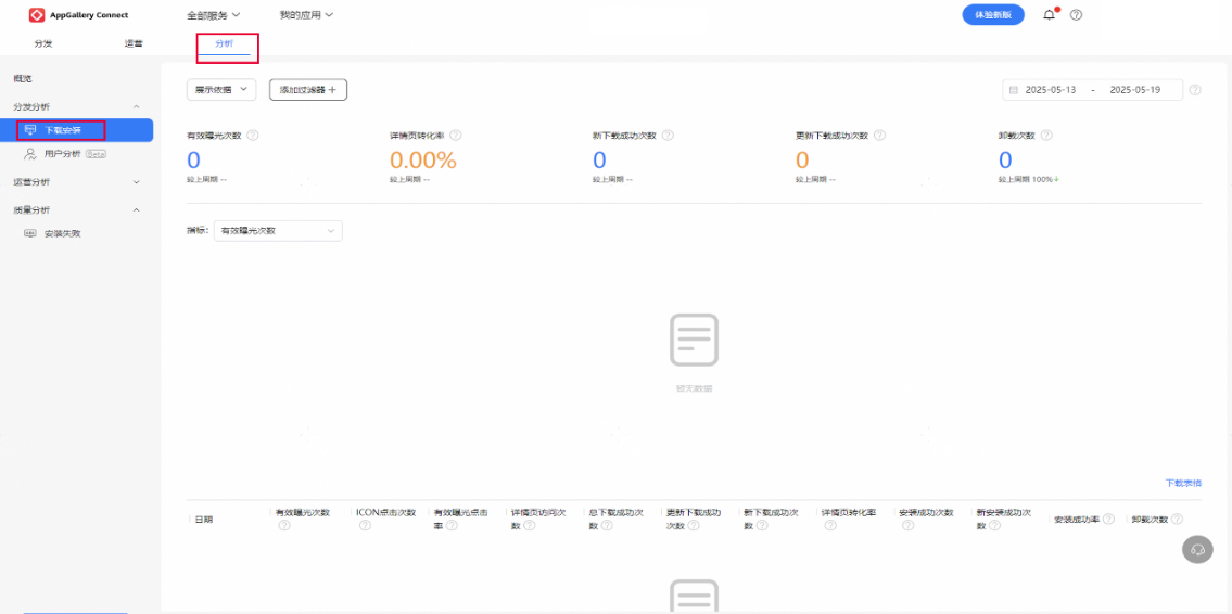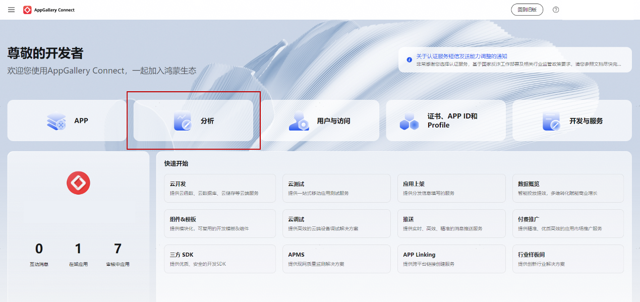 1. 登录华为AppGallery Connect,进入“应用分析”模块。