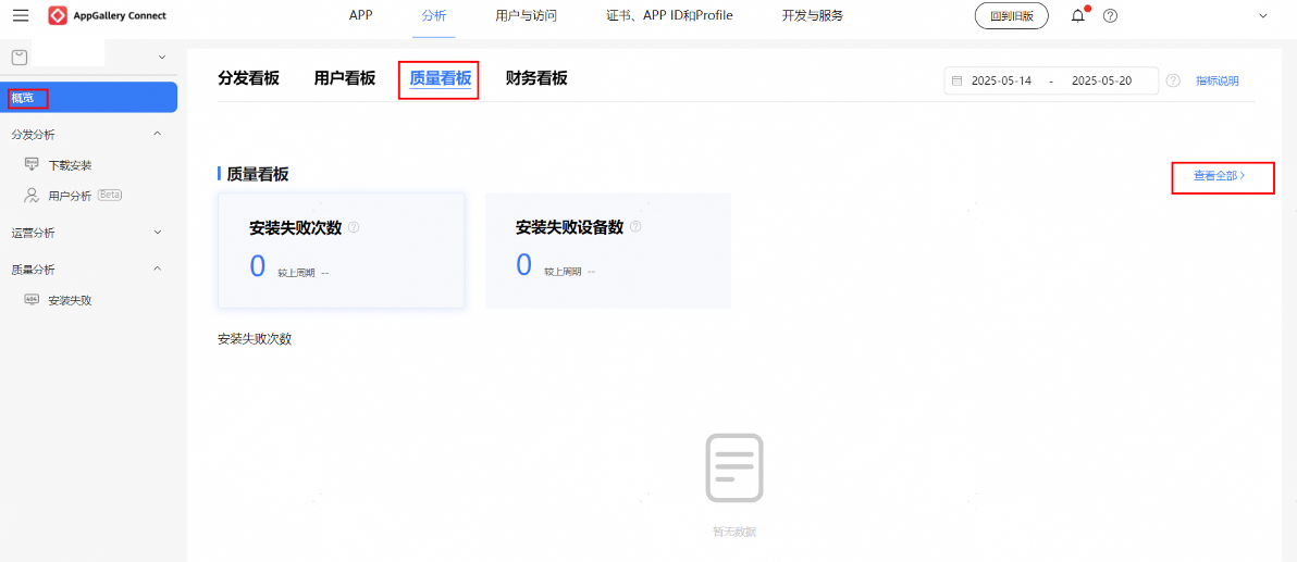 4、质量看板:安装失败看板中的错误原因、失败设备数、失败次数等指标,能为开发者提供关键的「技术优化方向」和「用户体验提升」洞察,帮助快速定位并解决安装环节的流失问题。