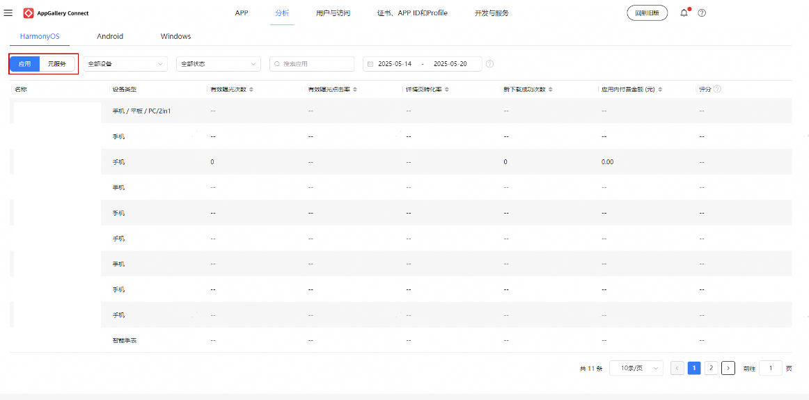 2. 选择“HarmonyOS”页签,查看所有应用的总览数据(如有效曝光、下载量、付费金额)。