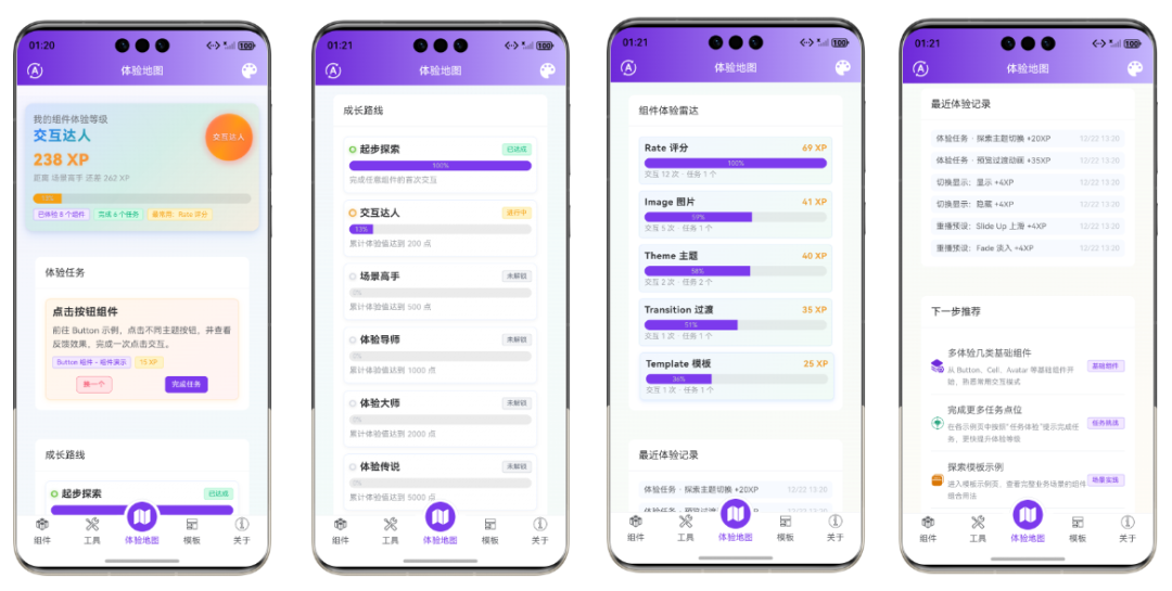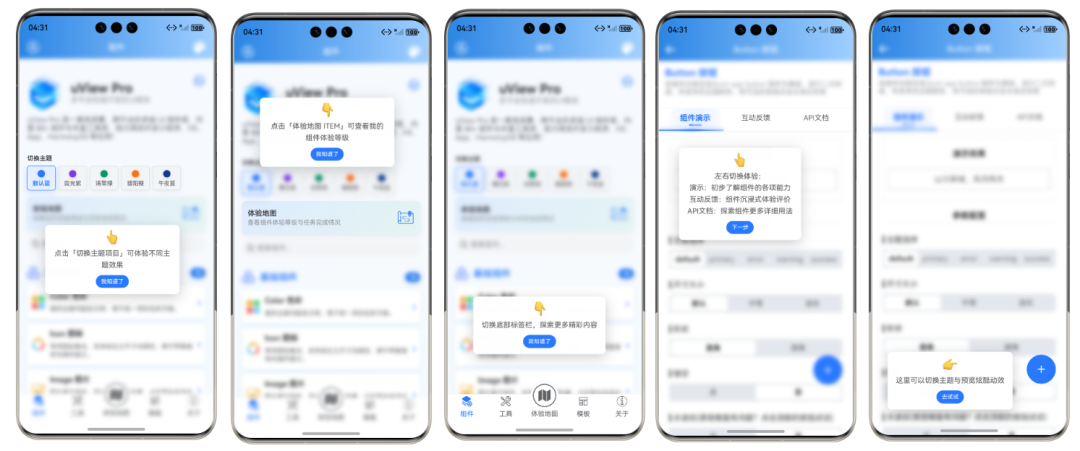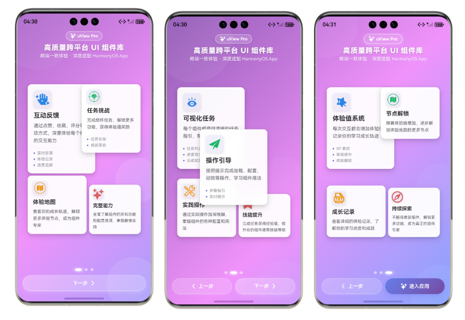 传统的组件库文档往往比较枯燥,而 uViewPro 鸿蒙应用引入了游戏化学习机制: