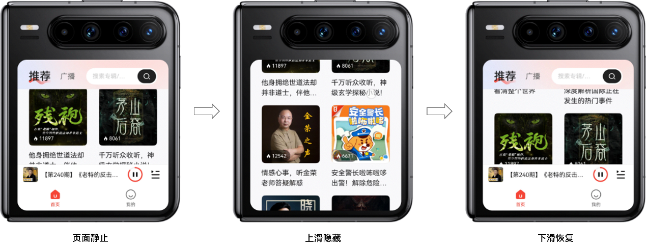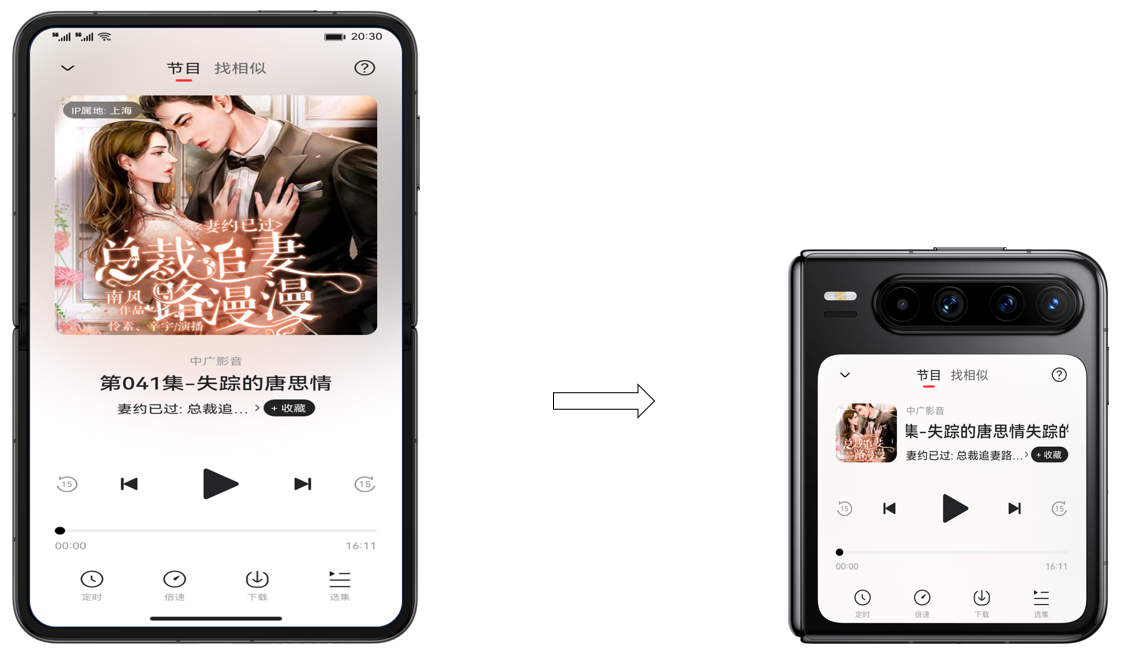 目前,蜻蜓FM等应用已依据HarmonyOS开发者官网一多专区的最佳实践,完成了对Pura X设备的响应式布局适配。如下图所示,采用挪移布局结合页面响应式能力,当Pura X为折叠态时,图片等比例缩小,图片和文字布局从上下结构切换为左右结构。