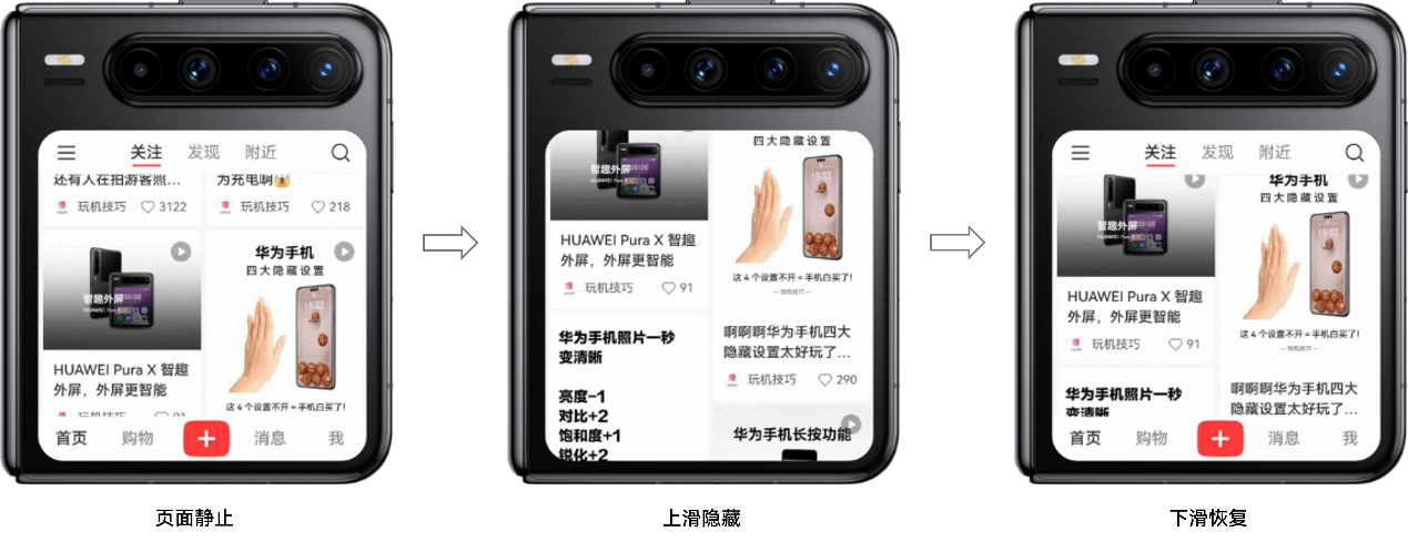 Pura X外屏滑动沉浸式浏览的设计形式,有助于用户更专注于内容本身:当用户向上滑动屏幕,可临时隐藏标题栏、页签栏等界面元素,实现全屏浏览;向下滑动时,页面元素通过动画效果重新显示,显著提升了外屏浏览效率。