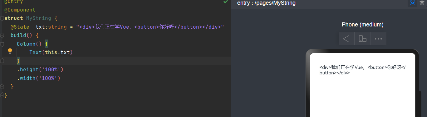 @State txt:string = "<div>我们正在学Vue,<button>你好呀</button></div>"