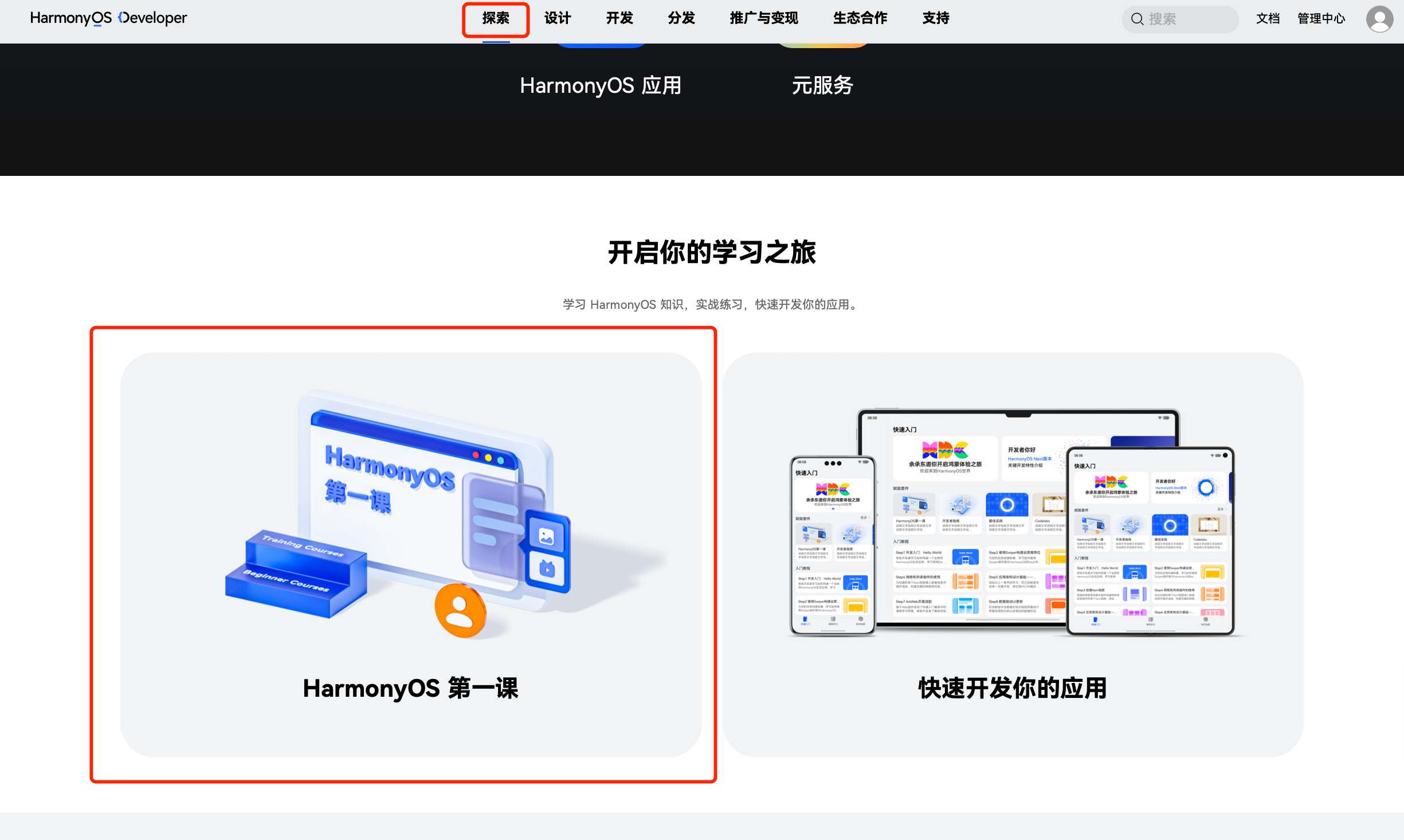 方式二、点击“探索”进入“HarmonyOS第一课”板块,下滑至“首席专家讲鸿蒙”专区学习首批课程。