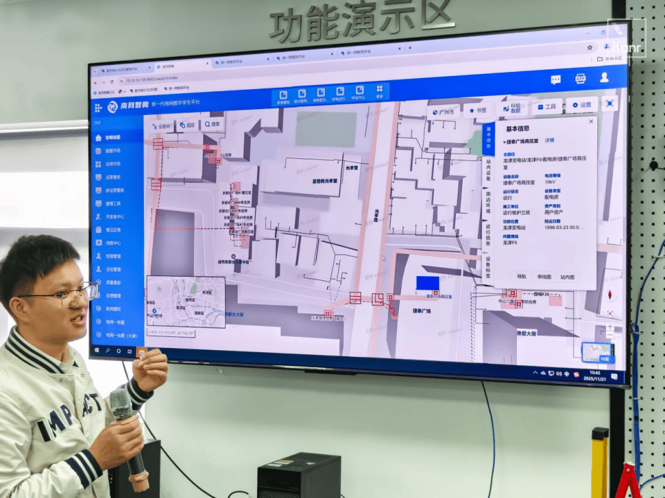 在错综复杂的线网可视化看板上,运维人员可远程直观查看实时数据——数据通过 5G 物联网 + 北斗卫星采集回传;在南方电网百万级平方公里的电网点云中一键放大至任意单基杆塔,其设备状态、周边道路与植被分布都一目了然。