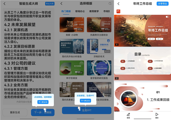 例如,鸿蒙版Aippt 制作师接入了小艺意图框架,核心功能“一句话调起应用制作 PPT”彻底颠覆了传统的PPT制作模式。无需提前打开软件、翻找模板,只需对小艺说出制作需求,应用便会依托大模型快速响应,自动生成逻辑清晰的演示大纲与配套内容文本,还能根据场景智能推荐适配的模板,支持实时预览并一键更换;同时AI会完成文字、图片的智能排版,优化页面整体协调性,若有个性化需求,还能手动微调字体、颜色等设计元素,从大纲构思到页面设计一步到位。
