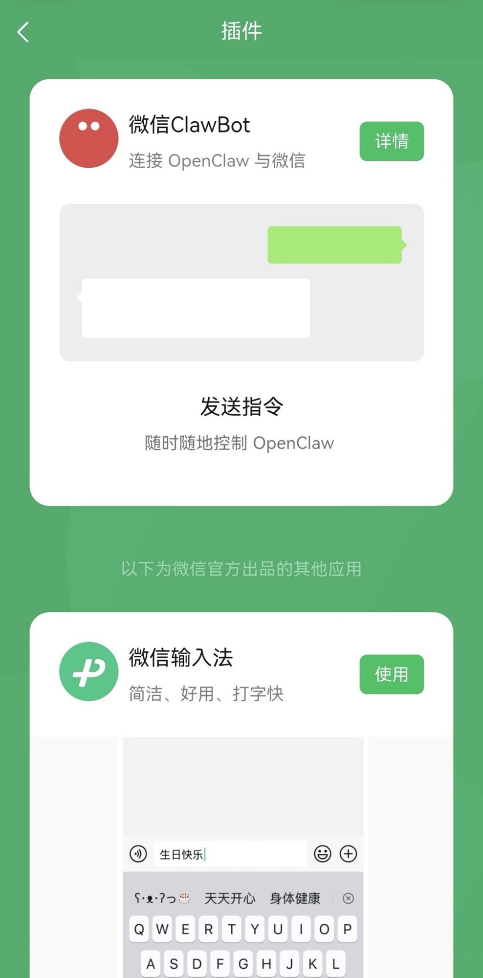 【设置方法】:在“我”-“设置”-“插件”里找到“微信ClawBot”,安装插件或扫码连接OpenClaw之后,就能在微信里与OpenClaw直接对话,指挥AI帮你干活。