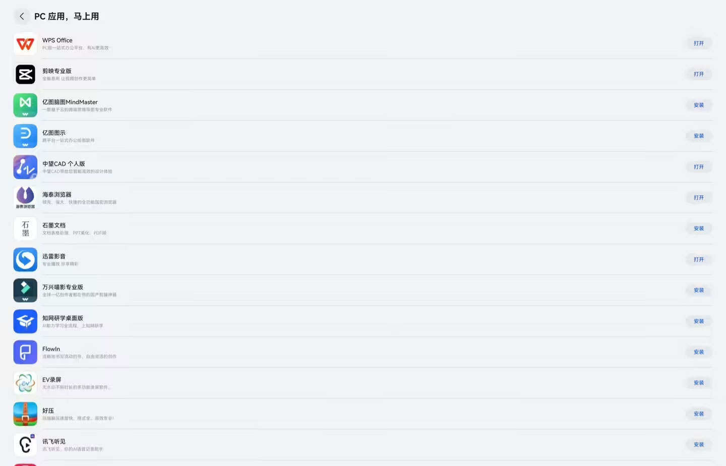 IT之家实测发现,华为 MatePad 系列平板的 PC 应用专区已上架约 20 款应用,包括 WPS Office、海泰浏览器、中望 CAD 个人版、悟空图像、万兴喵影专业版、剪映专业版、亿图图示等。