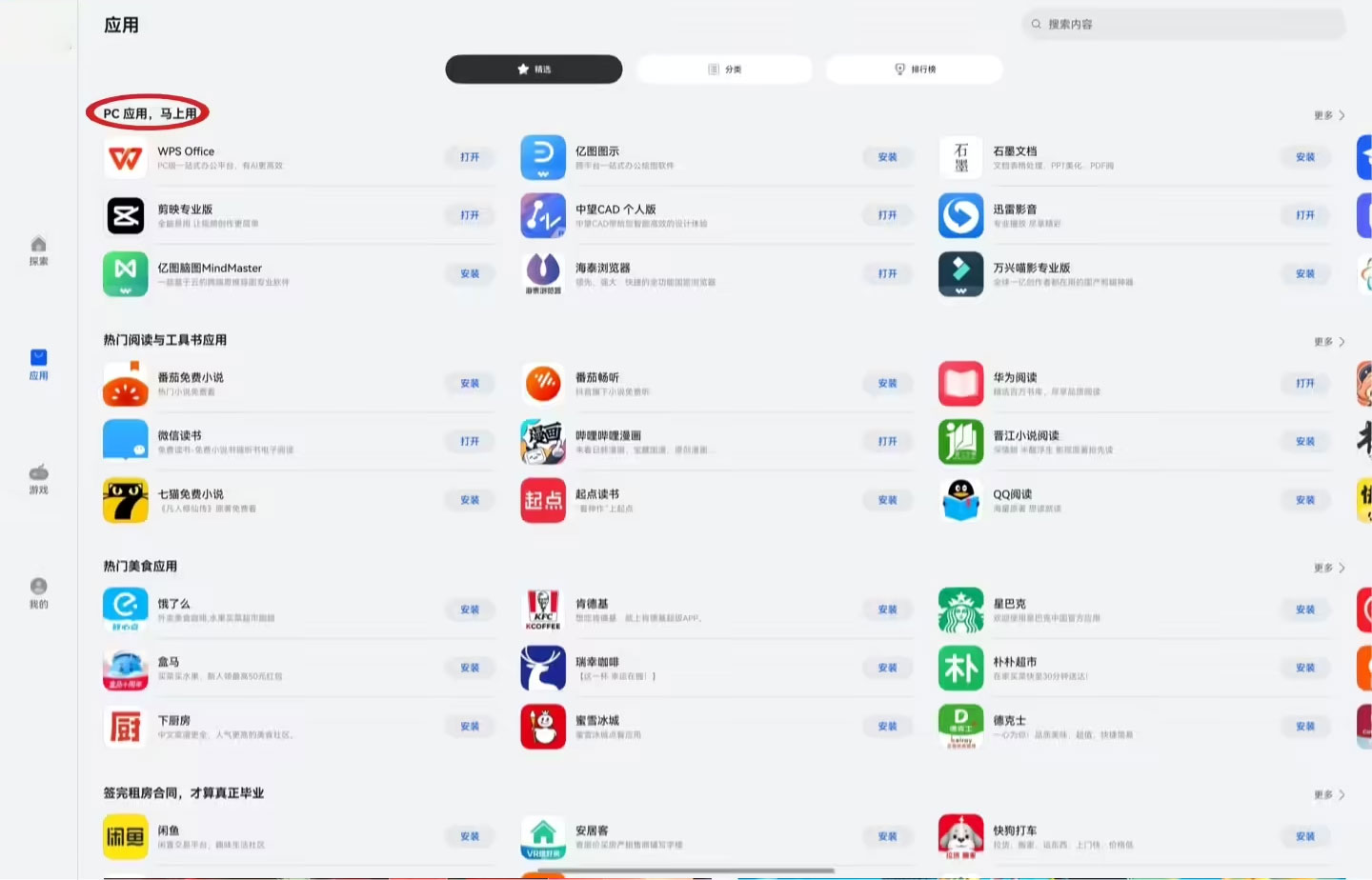 华为 MatePad 系列平板的 PC 应用专区正逐步上线,华为应用市场(App Gallery)的「首页」和「应用」板块均有该专区的快捷入口。