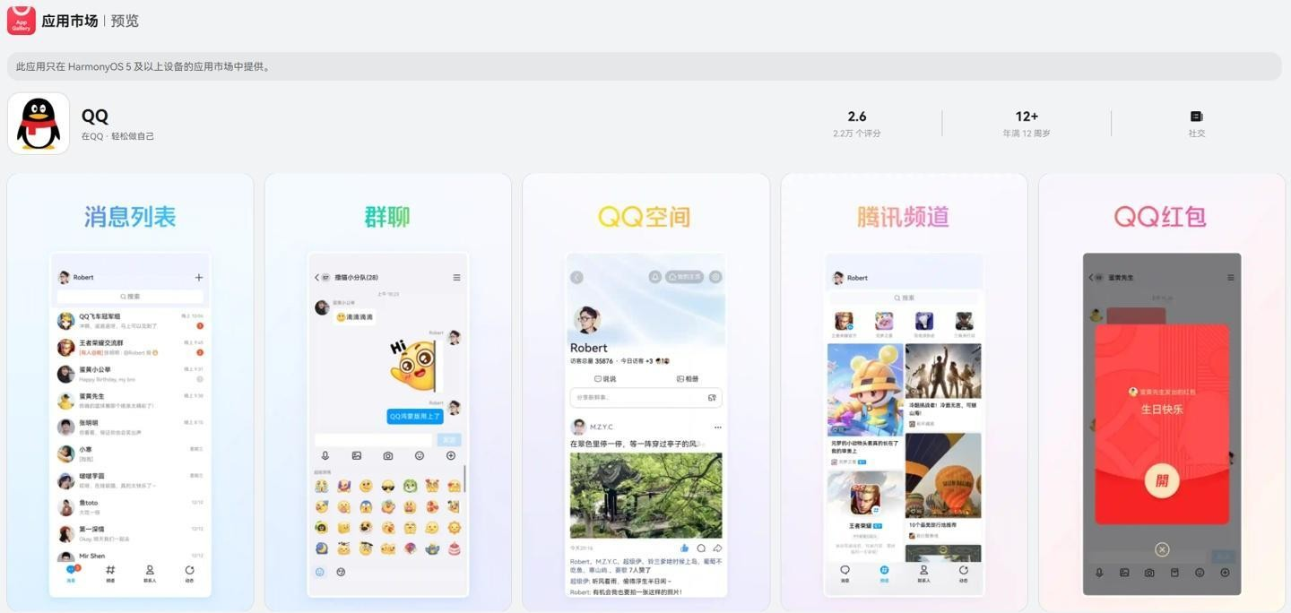QQ 鸿蒙版 App 于 2024 年上架华为应用市场尝鲜专区,当前正式版本为 9.2.15 (2782),安装量突破 3310 万、获 3.2 万个评分(评分 2.5),已支持单聊、群聊、多人语音或视频通话、抢红包,刷空间好友动态、短视频、频道、扫一扫、手机 / 平板双端登录等功能。