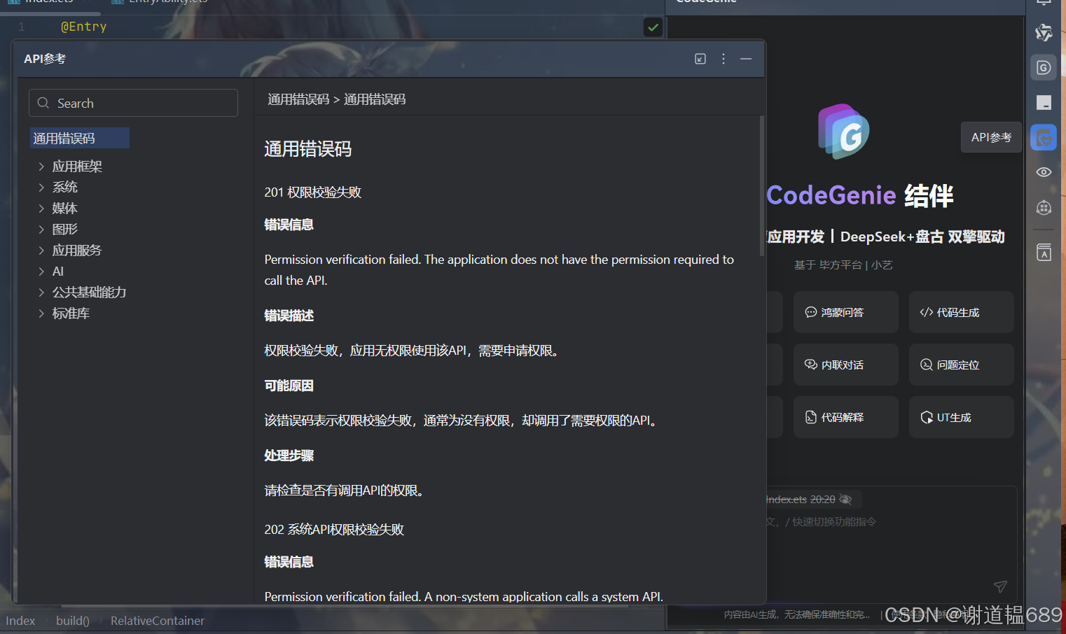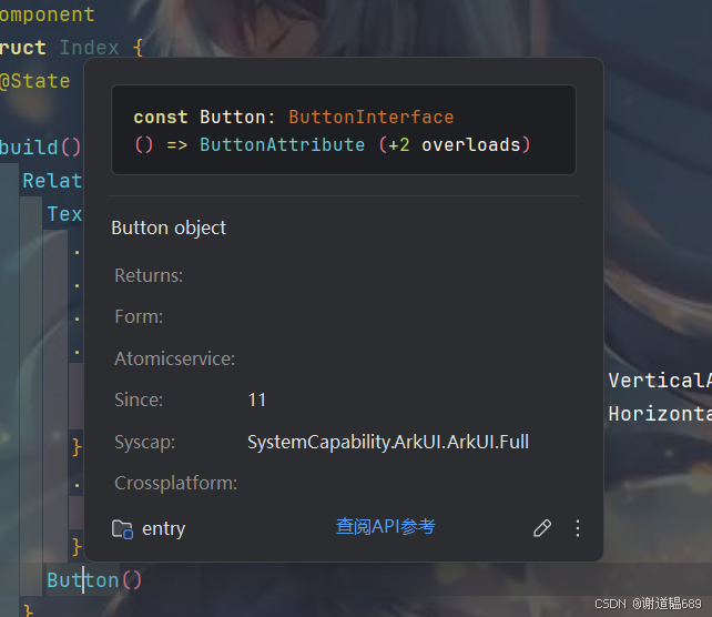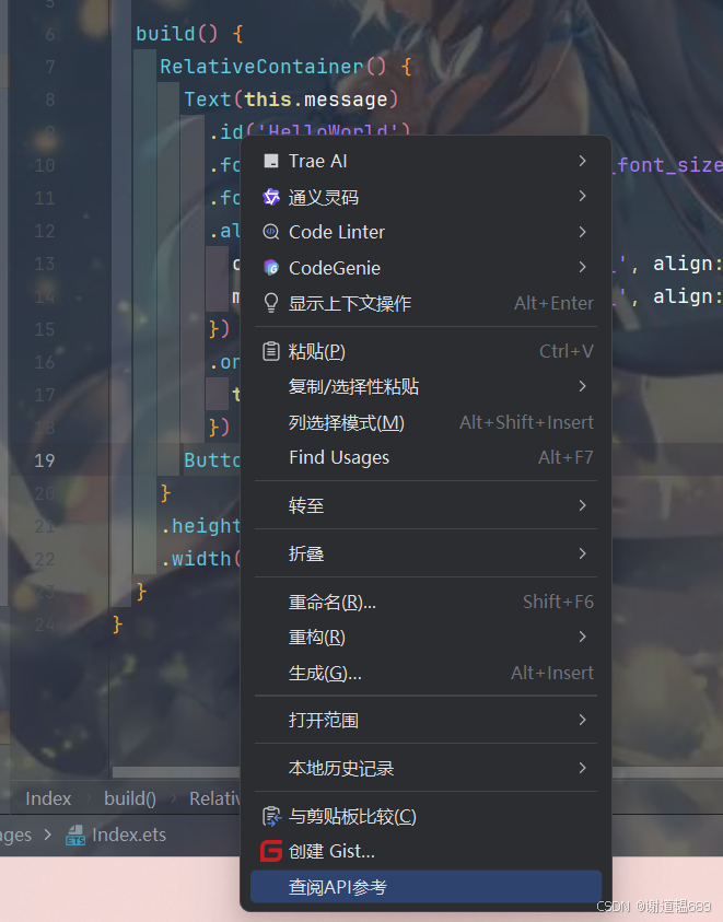 - 打开文档面板(右侧「API参考」标签),顶部会显示当前项目关联的 SDK 版本(如 “HarmonyOS API 20 ”),确保查阅的文档与项目
