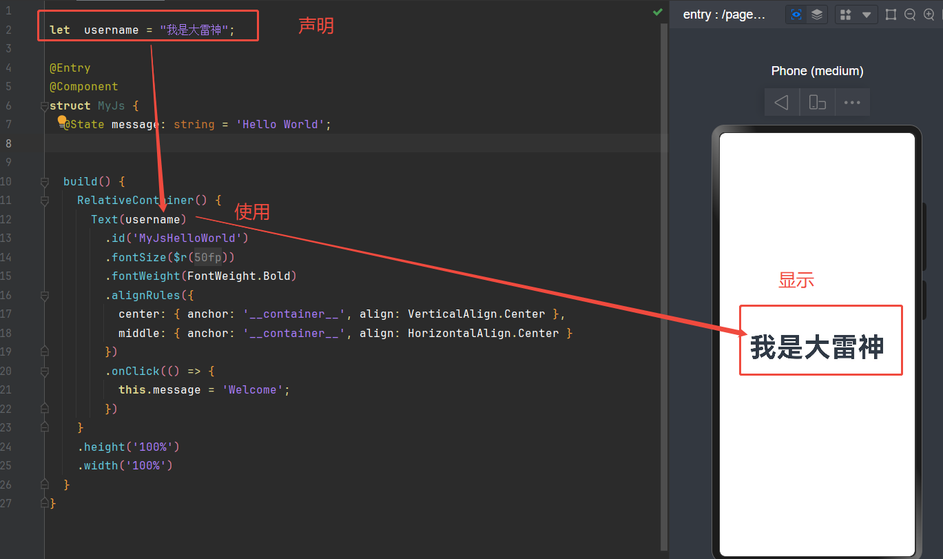 可以在鸿蒙页面声明JS变量 然后直接使用,但是不能修改,原因后面文章专门介绍数据驱动
