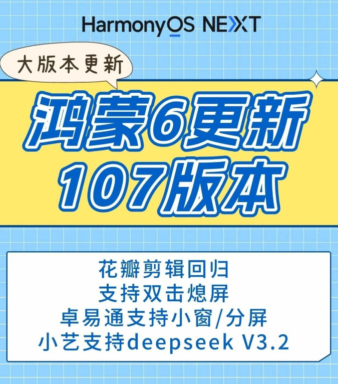 华为手机鸿蒙6迎来了6.0.0.107版本更新,这个是大版本更新,新增了许多功能,包括大家呼声很大的花瓣剪辑、卓易通应用小窗/分屏等等功能,具体更新如下: