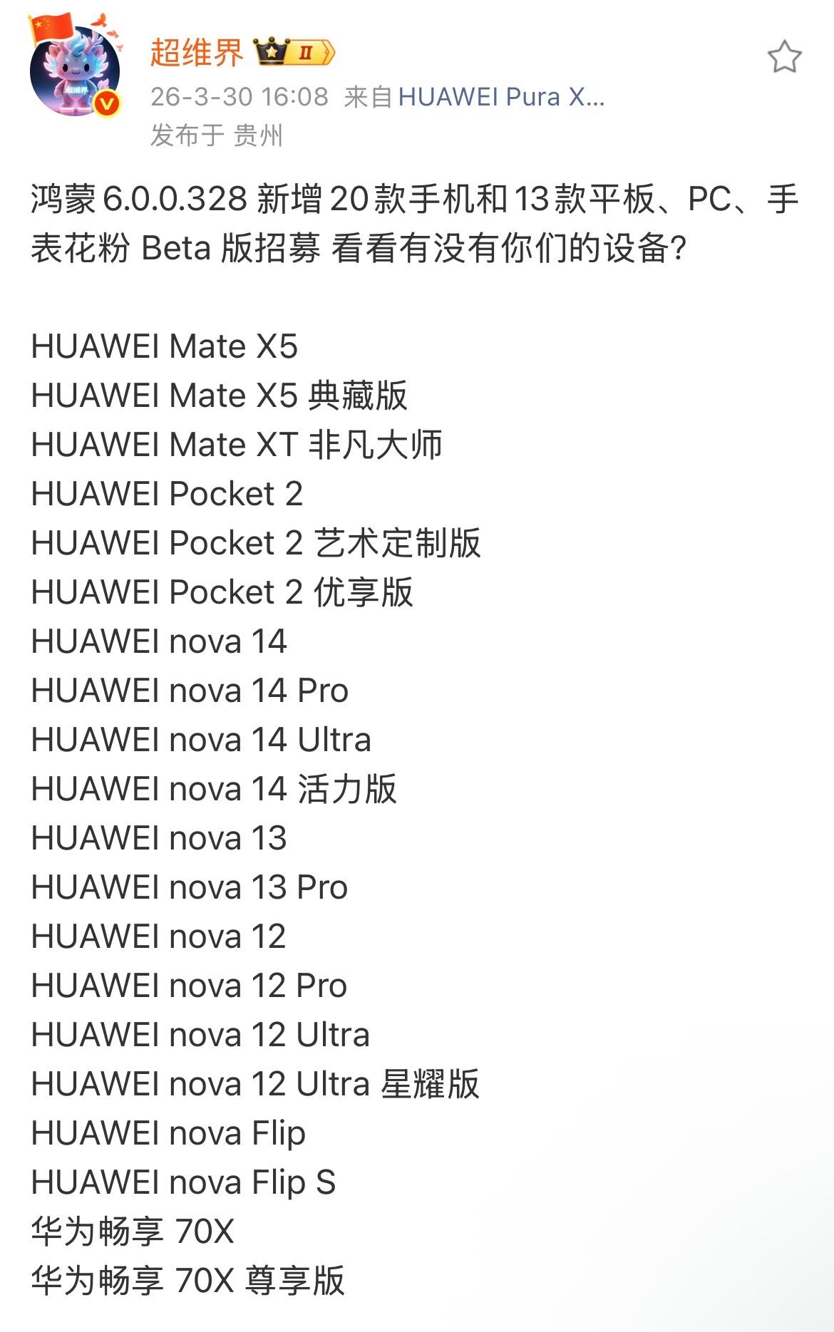 除了这次新增的Beta测试机型,其实还有一批机型已经进入了公测阶段。根据爆料,Mate 80等超过40款机型已经开启了“328”版本的公测。