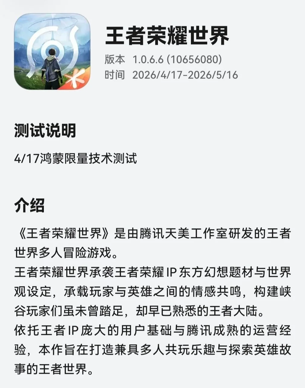 根据官方公告,《王者荣耀世界》将针对 HarmonyOS 5 和 HarmonyOS 6,于 2026 年 4 月 17 日开启限时技术测试,本次测试为限量付费不删档测试 。本次测试限量开放,测试开启后可下载游戏注册,测试数量有限,领完即止。