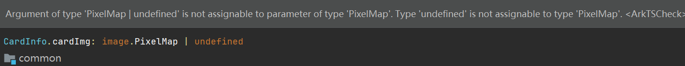 在实际鸿蒙项目开发过程中,经常会遇到类型不匹配问题,从A方法得到的数据类型为'PixelMap | undefined',接收过来需要传到B方法,它定义的接收参数类型只有PixelMap ,就会提示类型不匹配:Argument of type 'PixelMap | undefined' is not assignable to parameter of type 'PixelMap'. Type 'undefined' is not assignable to type 'PixelMap'
