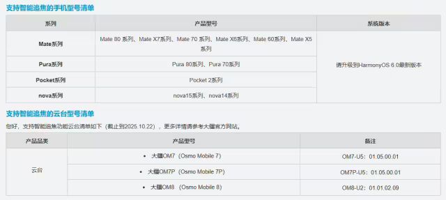 华为近日公布鸿蒙智能追焦功能支持情况,Mate 80/Pura 80/nova 15 系列等多款机型在列。
