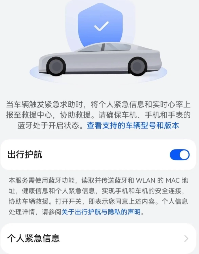 12 月 3 日消息,今年 5 月,华为 Mate 60、Pura 70 系列等手机开启了鸿蒙 HarmonyOS NEXT 5.0.1.120 版本升级,新增“出行护航”功能。当车辆触发紧急求助时,该功能可将个人紧急信息和实时心率上报至救援中心,协助救援。请确保车机、手机和手表的蓝牙处于开启状态。