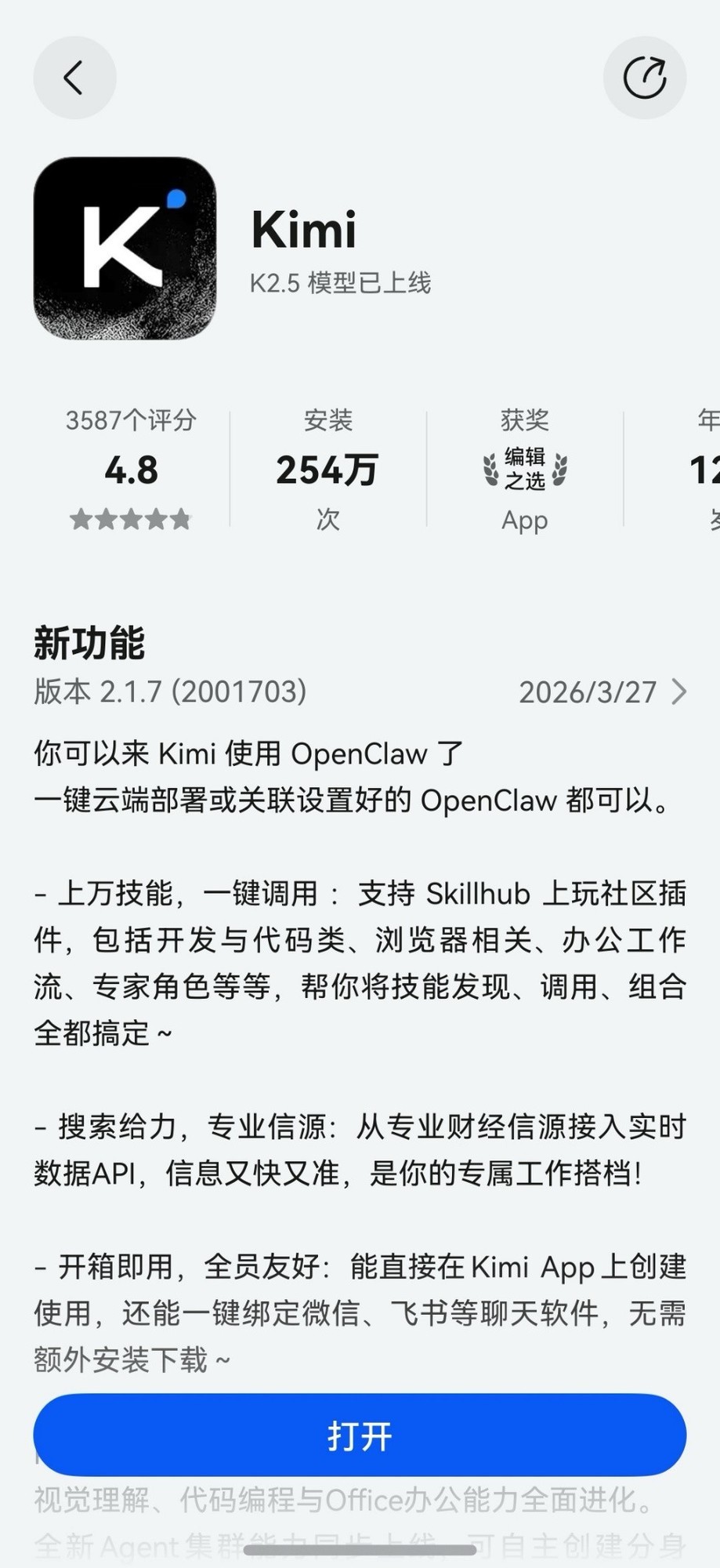 此次更新的另一大亮点,是鸿蒙版Kimi正式支持接入OpenClaw。接入后,OpenClaw可在鸿蒙版Kimi上开箱即用,还能一键绑定