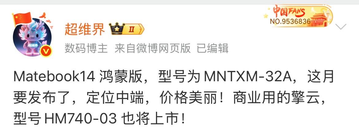 小码农也有梦 2026-04-10 11:20:59 发布今天给大家带来一个数码圈的热门消息。最近有数码博主爆料称,华为即将在本月发布两款鸿蒙笔记本新品,一款是面向消费市场的Matebook14鸿蒙版,另一款则是面向商用市场的擎云HM740-03。这个消息一出,立刻引起了广泛关注。