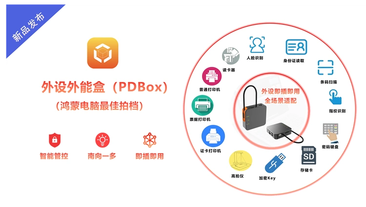 PDBox外设万能盒专注破解设备密集型行业多品牌外设兼容困局,深度服务金融、能源、电力、公安、政务等高安全场景。通过"一盒多联"技术驱动存量外设无缝接入鸿蒙系统,满足全场景合规要求,构建安全稳定高效的设备互联体系,全面加速企业数字化转型进程。