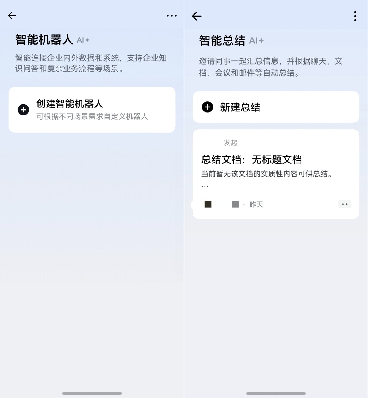 全面支持智能机器人:工作台新增“智能机器人”入口,支持机器人创建、查看与编辑,用户可快速解决工作疑问,获得专属AI助手的实时支持。
