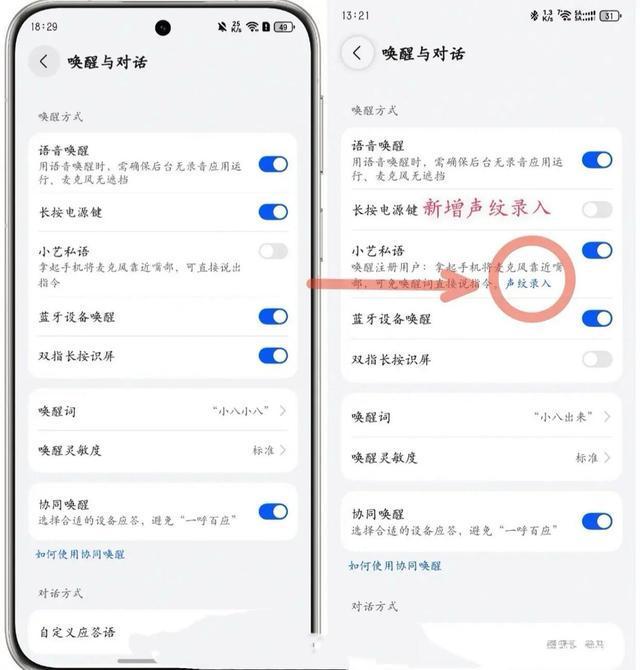 「长按电源键」唤醒小艺的选项下,新增了「声纹录入」。录入后小艺能更精准地识别机主声音,误唤醒的情况会减少。