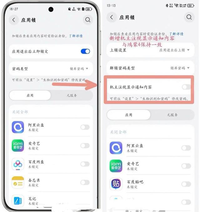 在「应用锁」设置中,新增了「机主注视显示通知内容」开关。开启后,只有机主注视屏幕时,加锁应用的通知详情才会显示。别人偷瞄的时候,内容自动隐藏。