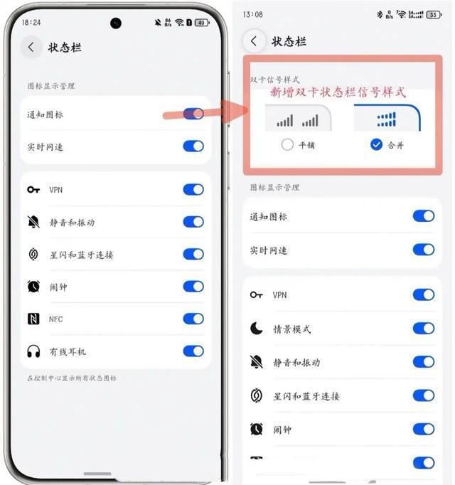 这次更新后,设置-通知和状态栏-状态栏里,新增了「平铺/合并」两种双卡信号样式。选「合并」,两个信号图标变成一个,清爽不少。
