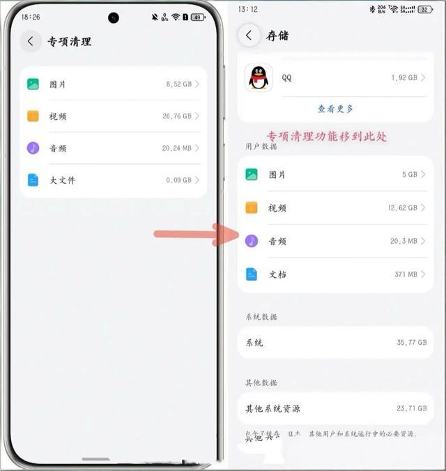 很多人之前根本找不到「专项清理」在哪。这次更新直接把它整合进了存储主页面,图片、视频、音频、文档分类一目了然,想清垃圾,点进去直接删。