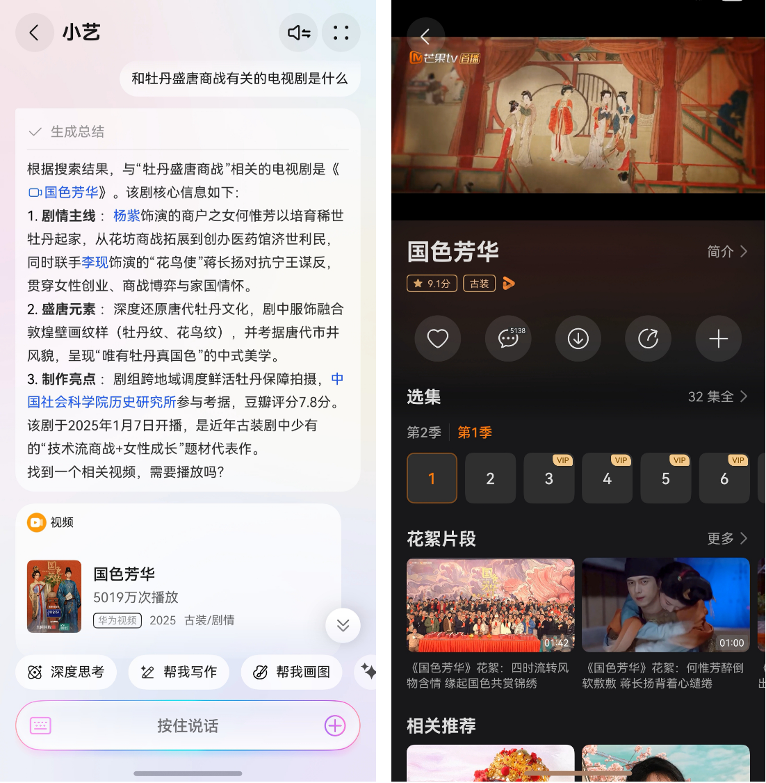 用户通过语音指令即可触发搜索,无论是《叶问》里振聋发聩的“我要打十个”,还是《功夫》里斧头帮团舞名场面,用户只需提供一句名台词或者对于画面场景的模糊描述,小艺可以快速穿透海量片库直抵目标内容,并提供华为视频片源跳转卡片,告别手动筛选。此外,无论是追寻经典台词的出处场景,还是探索演员的创作版图,“AI影视全能搜”都能快速生成个性化观影地图,推荐同类好剧或者演员参演的其他作品,让用户的“念念不忘”都有回响,每个记忆碎片都能成为打开精彩世界的钥匙。