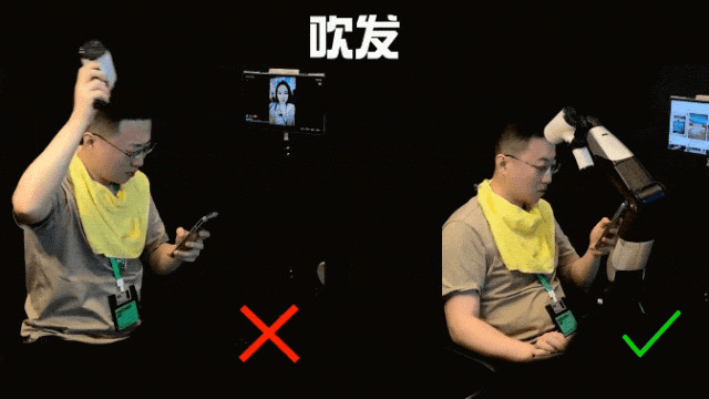 「TRI.ME 吹了么」发现,每天吹头发、刷牙的这十几分钟,是现代人最后一块没有被数字化的「注意力真空区」。所以他们选择用机械臂抓起吹风机,实时追踪头部位置进行自动化干预,同时把一块智能面板嵌入浴室场景,承载视听娱乐。