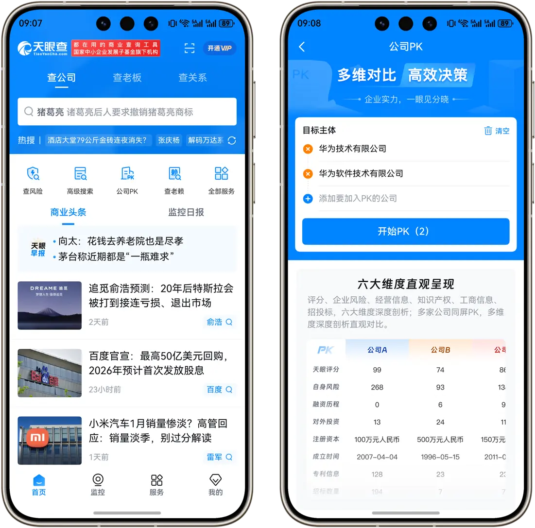 很多职场人都会用天眼查或企查查背调公司,但在鸿蒙上,这件事变得更直观了,鸿蒙版天眼查有个很实用的“公司PK”功能,不用来回切换窗口,就能把几家意向公司的评分、风险、经营状况并排对比,优劣一眼看清。鸿蒙版企查查则把数据覆盖到了全球超5.8亿家企业,股权结构、产业链关系一目了然,那些看似光鲜实则暗藏风险的“坑”,能帮你提前绕开。