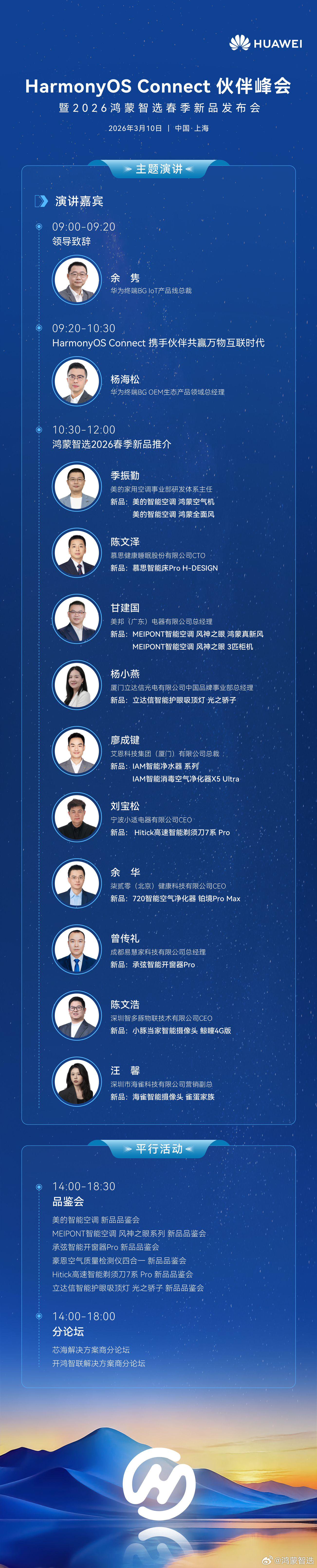 据介绍,华为终端 BG IoT 产品线总裁余隽、华为终端 BG OEM 生态产品领域总经理杨海松将在上午进行主题演讲。随后,10:30-12:00 将进行鸿蒙智选的新品推介,包括美的智能空调、慕思智能床、MEIPONT 智能空调、立达信智能护眼吸顶灯、IAM 智能净水器 / 空气净化器、Hitick 高速智能剃须刀、720 智能空气净化器、承弦智能开窗器、小豚当家智能摄像头、海雀智能摄像头等。