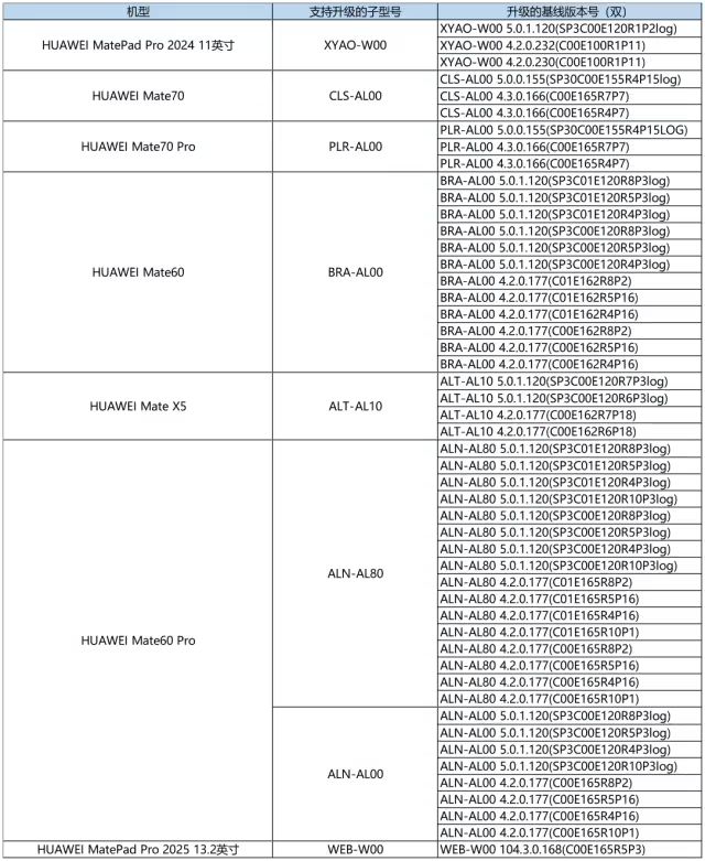 手机方面,包括华为 Mate 70/70 Pro、Mate 60/60 Pro、Mate X5。