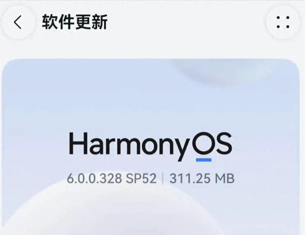 我凑过去一看,版本号是鸿蒙HarmonyOS 6.0.0.328 SP52。包挺小的,也就311MB。