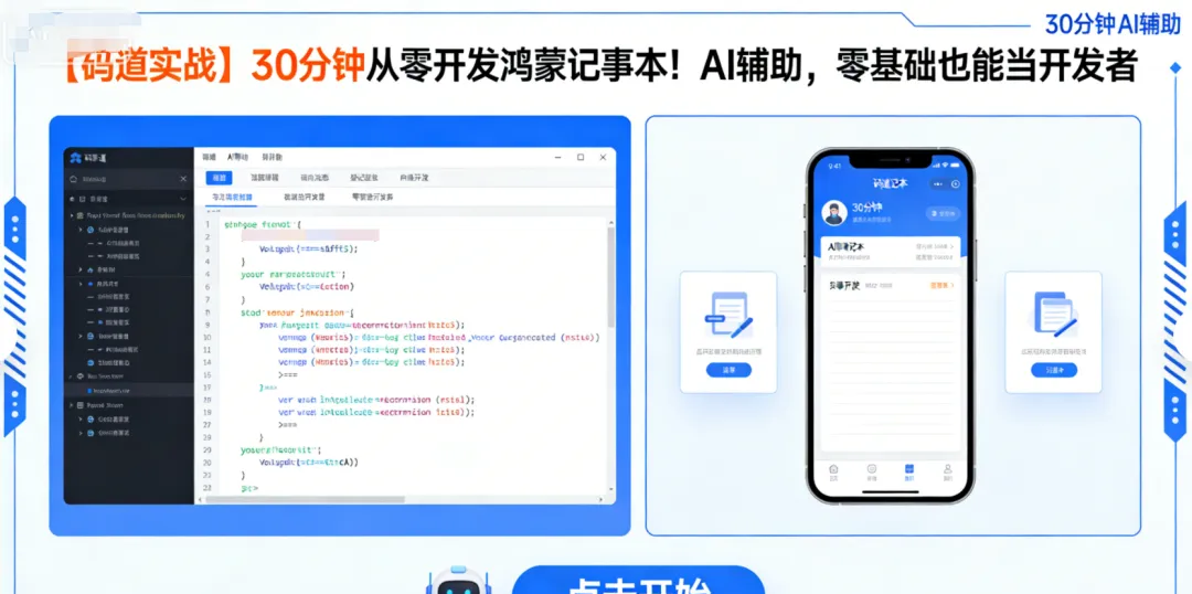 摘要:码道最新实战项目:你敢相信吗?仅用30分钟,没有任何鸿蒙开发基础,只通过文本输入和AI对话,就完成了一个功能完整的鸿蒙记事本应用!包含用户注册登录、多用户数据隔离、笔记增删改查等全套功能。本文将详细记录这场“神奇的开发之旅”,展示码道推崇的AI如何让编程变得如此简单。