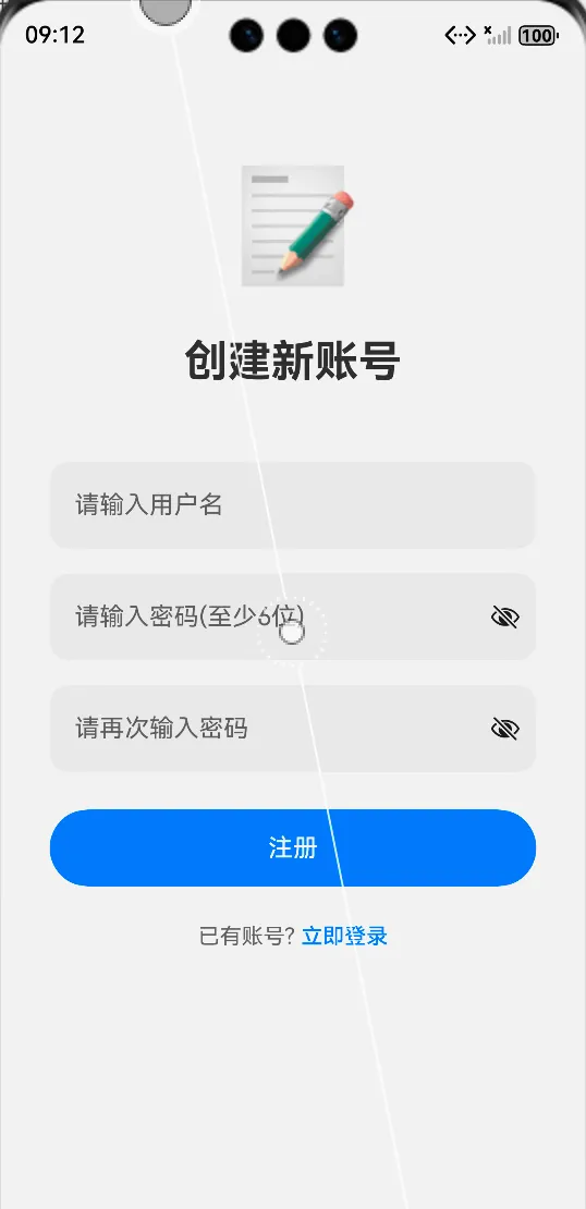 public async register(username: string, password: string): Promise<AuthResult> { // 1. 验证用户名 if (!username.trim()) return { success: false, message: '用户名不能为空' }; // 2. 验证密码长度 if (password.length < 6) return { success: false, message: '密码长度不能少于6位' }; // 3. 检查唯一性 const existingUser = this.users.find((user: User) => user.username === username); if (existingUser) return { success: false, message: '用户名已存在' }; // 创建并保存 const newUser = new User(Date.now().toString(), username, password); this.users.push(newUser); await this.saveUsers(); return { success: true, message: '注册成功' };}2. 美观的UI组件