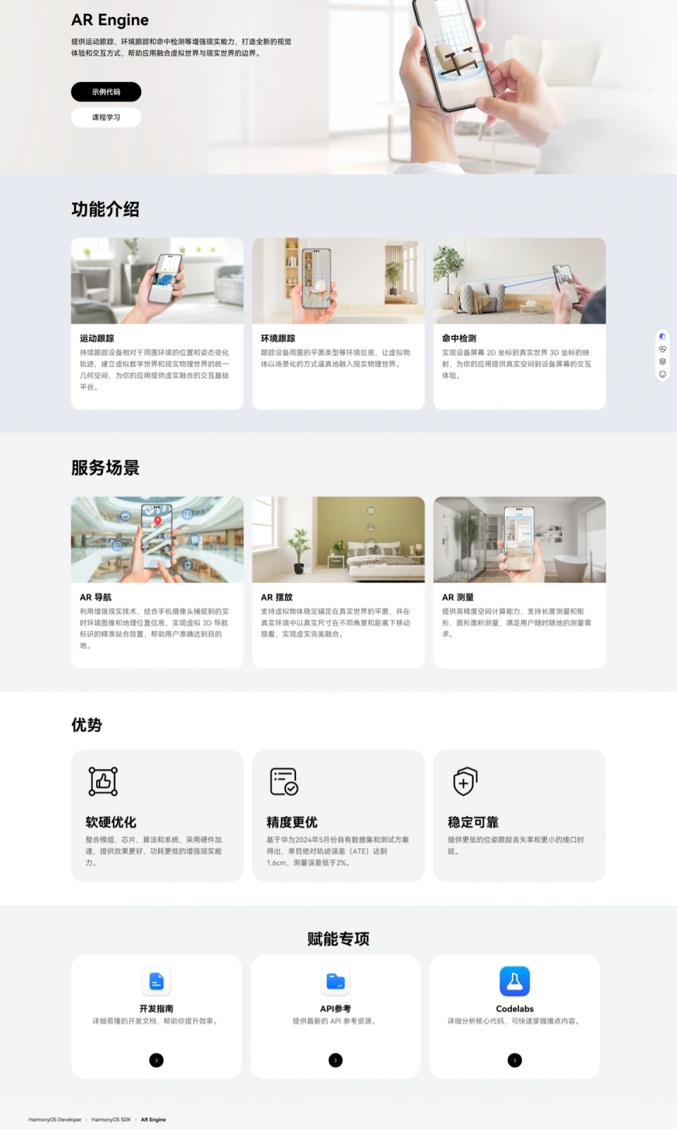 华为官方表示,AR Engine 具备软硬优化、精度更优等优势,基于华为 2024 年 5 月份自有数据集和测试方案得出,单目绝对轨迹误差(ATE)达到 1.6cm,测量误差低于 2%。
