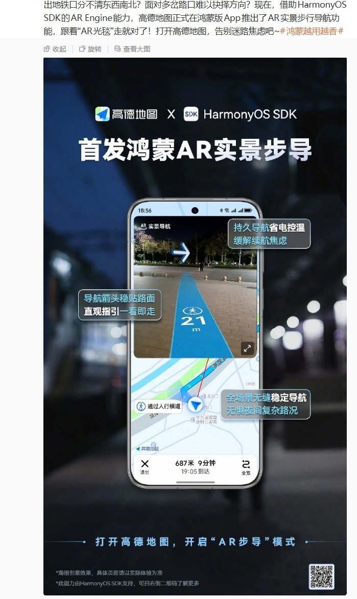 3 月 6 日消息,据华为手机官方今日介绍,基于 HarmonyOS SDK 的 AR Engine 能力,高德地图正式在鸿蒙版 App 首发了 AR 实景步行导航功能。