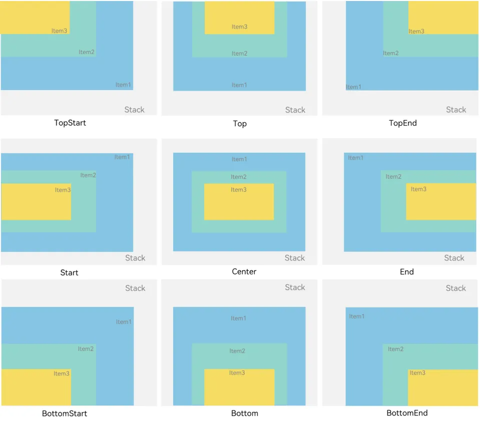 - 上区域:顶部左对齐(TopStart)、顶部居中(TopCenter)、顶部右对齐(TopEnd)——比如页面顶部的标题栏,可根据需求靠左、居中或靠右放置。