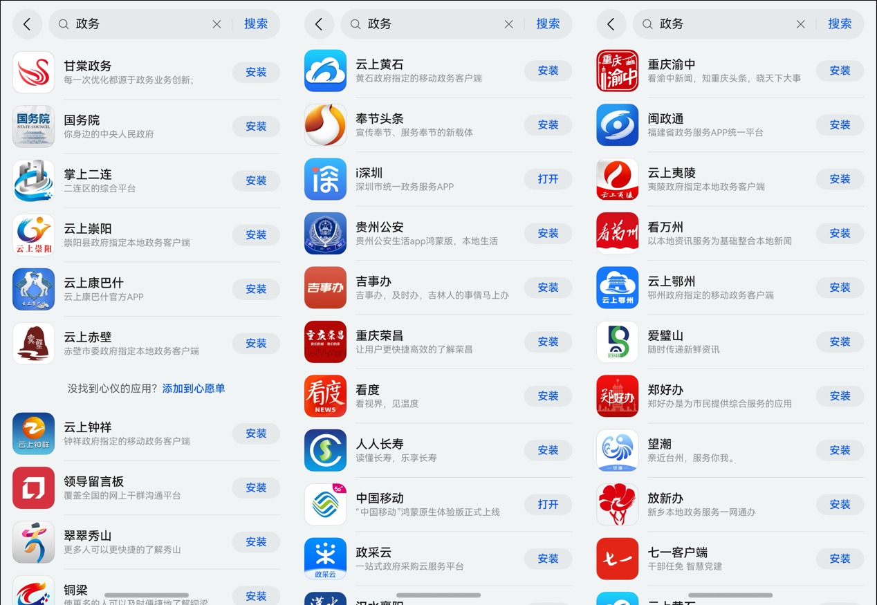 已升级HarmonyOS NEXT的朋友们可以前往应用市场搜索一下看看,如果自己常用的政务App还没上线,记得提交“心愿单”,说不定很快就会上线了!希望还没上架鸿蒙版应用的省市可以加快开发,让更多人可以在纯血鸿蒙上获得智能化、人性化的政务服务。对了,如果急用,也可以先用鸿蒙原生版支付宝中的“市民中心”或各地政务服务小程序办理业务,也很方便~