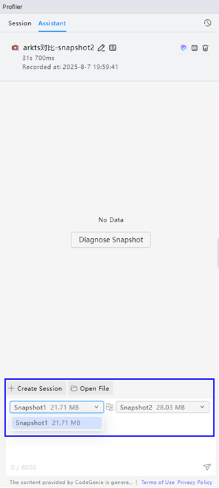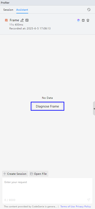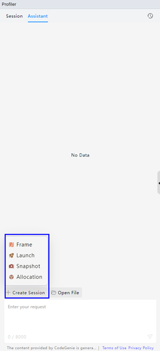 智慧调优当前支持引导录制新调优任务和直接分析已有调优数据文件两种开启方式,开发者可通过点击Create Session录制新调优任务或点击CodeGenie图标/Open File直接分析已有调优数据文件: