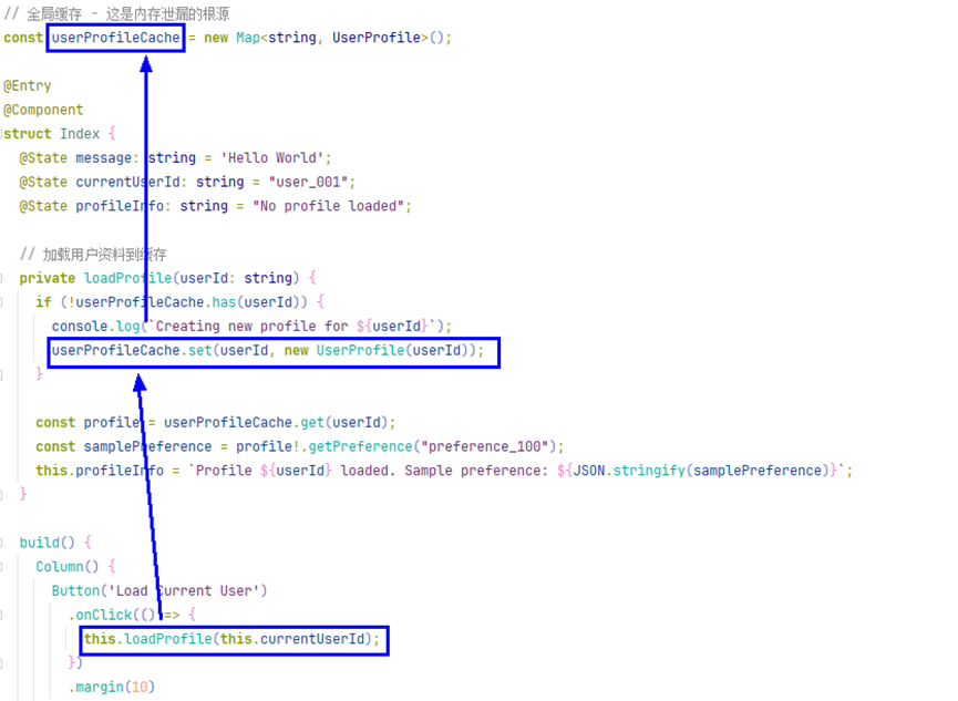 在应用开发中,开发者经常依赖GC自动管理内存,忘记释放全局对象中存在的无用缓存,导致内存持续上涨,以下是一个常见代码示例: